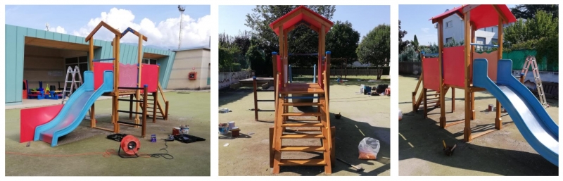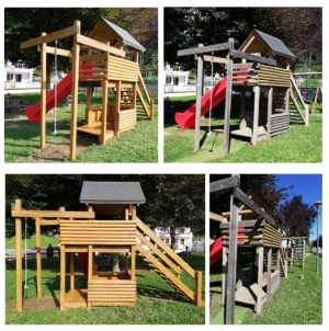 Intervento di rinnovo e manutenzione gioco datato. Sostituzione del tetto, aggiunta semilavorati danneggiati, pulizia, trattamento con fondo per legni disgregati, trattamento con finitura per esterni.