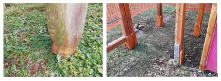 Taglio dei pilastri a livello terreno, rimozione del plinto, montaggio di staffa metallica di sostegno e ripristino del plinto, i pilastri ancora in buono stato sono stati protetti dall'usura dei decespugliatori da tavolette in legno.