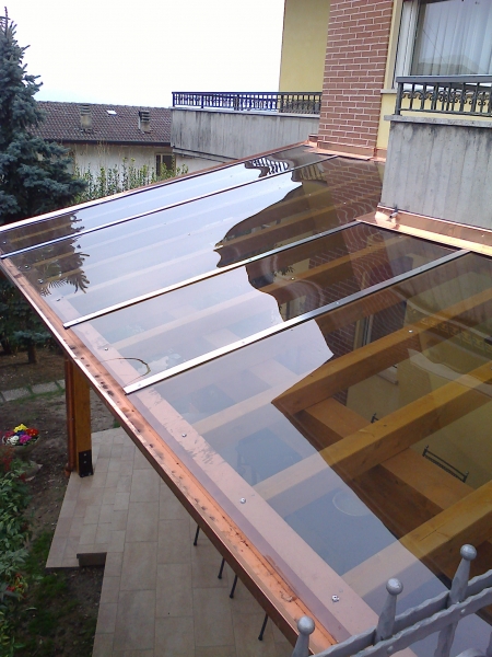 Pompeiana addossata in legno lamellare, copertura in policarbonato a lastra compatta bronzato e opere di lattoneria in rame 6/10.