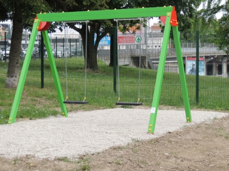 Altalena a due posti con portante in tubolare di acciaio, movimenti anti grippaggio, catene calibrate, seggiolini antitrauma, pilastri rinforzati in plastica riciclata con staffe a terra per inghisaggio.