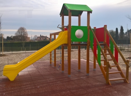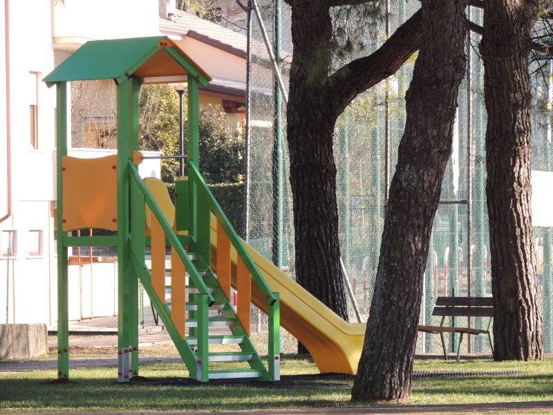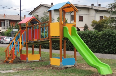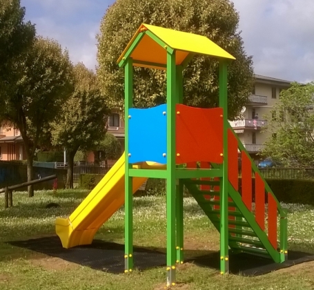 Gioco per parchi pubblici senza sorvenglianza con struttura portante in alluminio, pannelli in polietilene colorato tutta massa, scivolo in polietilene, staffe in acciaio zincato per il fissaggio a terra.