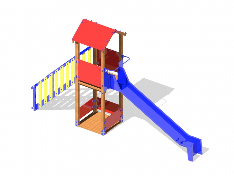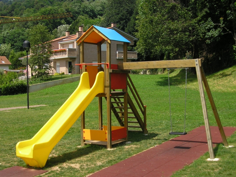 Torre in legno autoclave, con pannelli e scivolo in PEHD, pilastri con staffe zincate, bulloneria in acciaio con dadi inclusi in copridado, portante altalena in lamellare, movimento antigrippaggio, catene calibrate, seggiolino antitrauma. Disponibile anche in alluminio o plastica riciclata.
