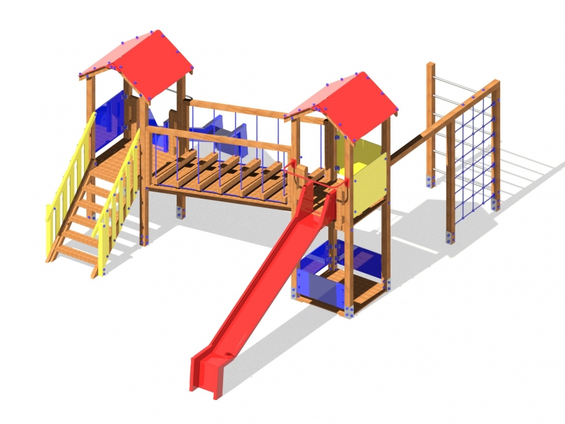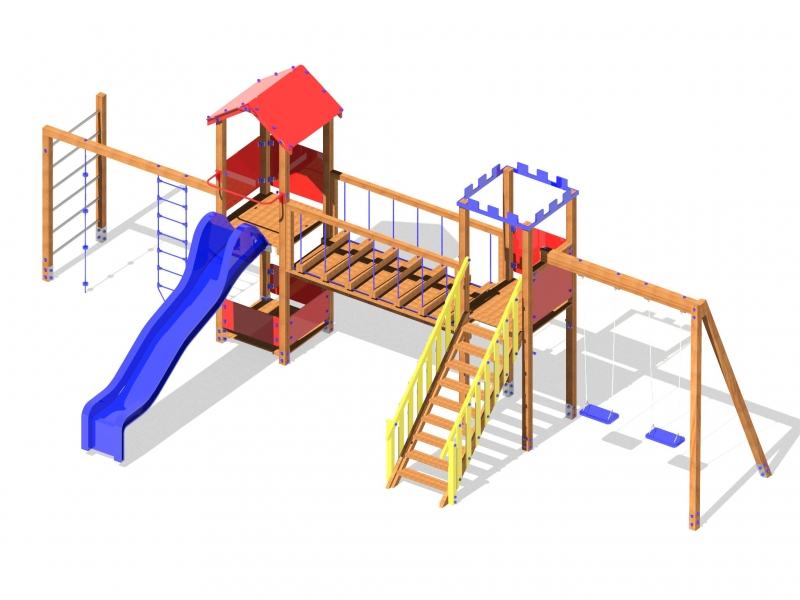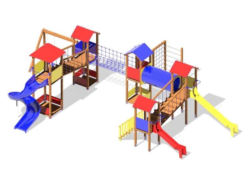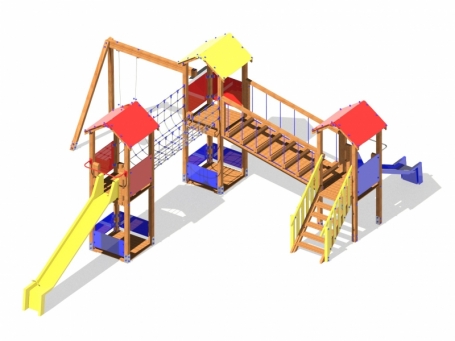 Castello in legno autoclave, pannelli e scivoli in PEHD, composto da tre torri con tetto a diverse altezze, scala di accesso, due negozietti, un ponte tibetano ed un ponte mobile, una scala di accesso. Disponibile anche in alluminio o plastica riciclata.