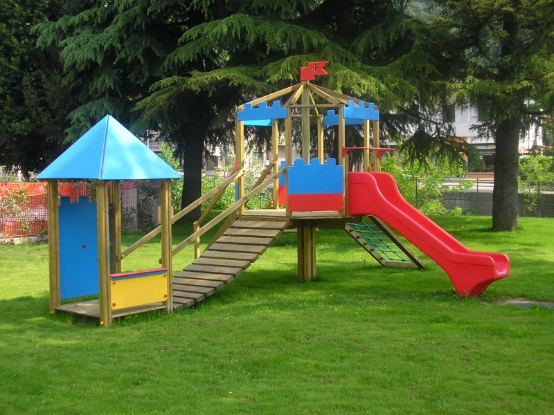 Castello in legno autoclave, pannelli e scivoli in PEHD, composto da due torri con tetto a diverse altezze, scala di accesso, palestrina con rete e spalliera, un negozietto. Disponibile anche in alluminio o plastica riciclata.
