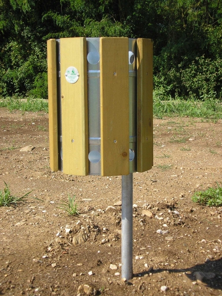 Composto da un fusto in foglio di lamiera zincata ed è rivestito esternamente da mezzi pali in legno di pino impregnato in autoclave tornito. Due delle doghe di rivestimento, tra loro opposte, proseguono verso il terreno acquisendo funzione di supporto.