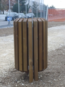 Il cestone è formato da doghe verticali di sezione 45x55 mm in legno pino impregnato in autoclave, con estremità sagomate a 45°. L’anello inferiore è completo di piatto trasversale di sostegno del fusto interno estraibile in lamiera zincata.