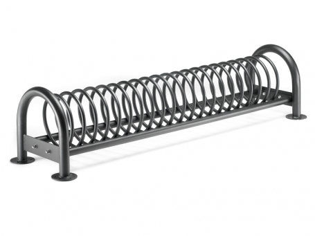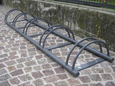 Portabiciclette ottenute una spirale in tubolare Ø22 mm saldata a coppia di tondi Ø48 mm uniti tra loro alle estremità da piatti metallici, l’elemento ottenuto è fissato tramite bulloneria inox a supporti calandrati Ø48 mm. Tutte le parti metalliche sono zincate a caldo e verniciate e polveri.