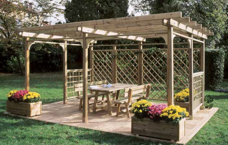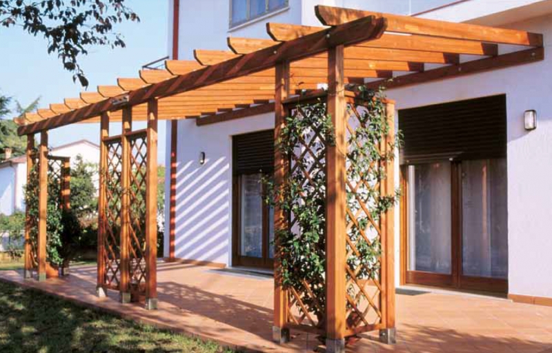 Pergolato autoportante in legno pino impregnato in autoclave, composta da pilastri 90x90 mm, portanti ed arcarecci sezione 115x45 mm, kit di montaggio completo di istruzioni, staffe per il fissaggio a terra, viteria e bulloneria di assemblaggio.